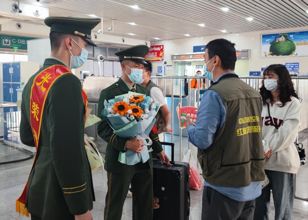 3月1日,中山市坦洲鎮(zhèn)退役軍人服務中心工作人員會同退役士兵家屬前往珠海明珠站迎接中山市2023年首批春季退役士兵平安返鄉(xiāng)。在車站出口,工作人員為退役士兵獻上鮮花,退役士兵與家人深情相擁,“最可愛的人”返鄉(xiāng)第一時間就感受到了來自家鄉(xiāng)及親人的貼心服務和溫暖。