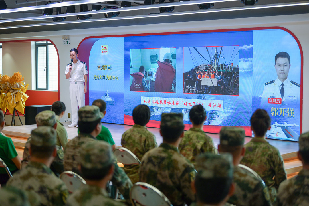 郭開強(qiáng):勇闖大洋 為國(guó)爭(zhēng)光 2008年12月,應(yīng)聯(lián)合國(guó)授權(quán)請(qǐng)求,奉中央軍委命令,南海艦隊(duì)武漢艦、??谂?、微山湖艦組成第1批護(hù)航編隊(duì),拉開了人民海軍舉世矚目的亞丁灣、索馬里護(hù)航序幕,這是自600多年前鄭和下西洋以來(lái),中國(guó)真正意義上的遠(yuǎn)海非戰(zhàn)爭(zhēng)軍事行動(dòng),開啟了人民海軍從“黃水”駛向“藍(lán)水”的壯麗航程。 91878部隊(duì)郭開強(qiáng)干事為大家?guī)?lái)主題宣講《勇闖大洋 為國(guó)爭(zhēng)光》。 郭開強(qiáng)介紹—— 迄今為止,人民海軍已累計(jì)派出44批100余艘次艦艇參加亞丁灣、索馬里海域護(hù)航,完成1500多批7000余艘中外船舶護(hù)航任務(wù),解救、接護(hù)各類船舶近百艘,其中外國(guó)船舶超過(guò)50%。 護(hù)航官兵一次次直面生死、一次次化解危機(jī)、一次次挑戰(zhàn)極限,用忠誠(chéng)與奉獻(xiàn)、責(zé)任與擔(dān)當(dāng),彰顯大國(guó)海軍形象,譜寫了人民海軍邁向世界一流海軍的新時(shí)代壯歌。 張長(zhǎng)城分享軍旅故事。記者 易承樂(lè) 攝
