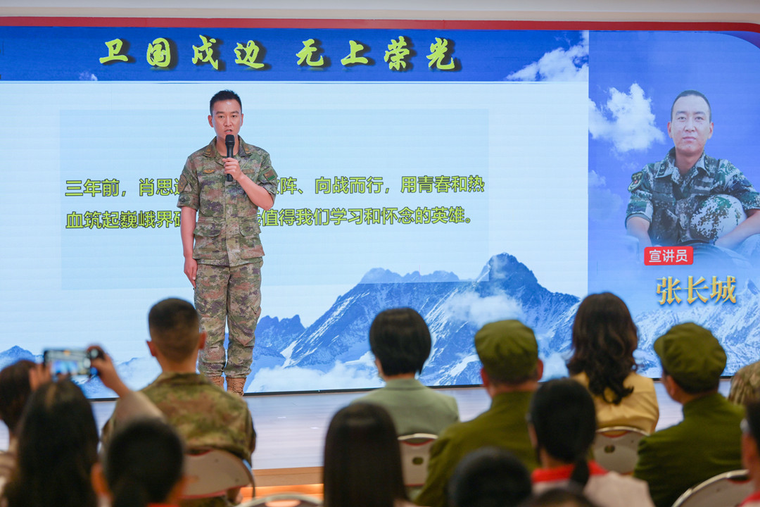 張長(zhǎng)城:肖思遠(yuǎn)的名字永遠(yuǎn)留在連隊(duì) “我是69316部隊(duì)加勒萬(wàn)邊防連‘肖思遠(yuǎn)班’班長(zhǎng)張長(zhǎng)城,很高興今天有機(jī)會(huì)跟大家進(jìn)行交流。三年前,肖思遠(yuǎn)班長(zhǎng)兩闖敵陣、向戰(zhàn)而行,用青春和熱血筑起巍峨界碑,是永遠(yuǎn)值得我們學(xué)習(xí)和懷念的英雄……” 張長(zhǎng)城現(xiàn)場(chǎng)作了主題為《衛(wèi)國(guó)戍邊 無(wú)上榮光》的宣講。 張長(zhǎng)城說(shuō)—— 肖班長(zhǎng)犧牲后,連隊(duì)組建了“肖思遠(yuǎn)班”,班里有一張肖班長(zhǎng)的床,每天晚上,戰(zhàn)士們都會(huì)將肖班長(zhǎng)的被子打開,早上起床再將被子工工整整的疊好;晚上點(diǎn)名,班里的同志輪流向肖班長(zhǎng)匯報(bào)本班和個(gè)人的工作。 連隊(duì)每天的點(diǎn)名,呼點(diǎn)的第一個(gè)名字永遠(yuǎn)是“肖思遠(yuǎn)”,全連齊聲答“到、到、到”,那一刻,感覺(jué)下面所有人,望過(guò)去都是他! ▌與現(xiàn)場(chǎng)基層干部群眾互動(dòng)交流