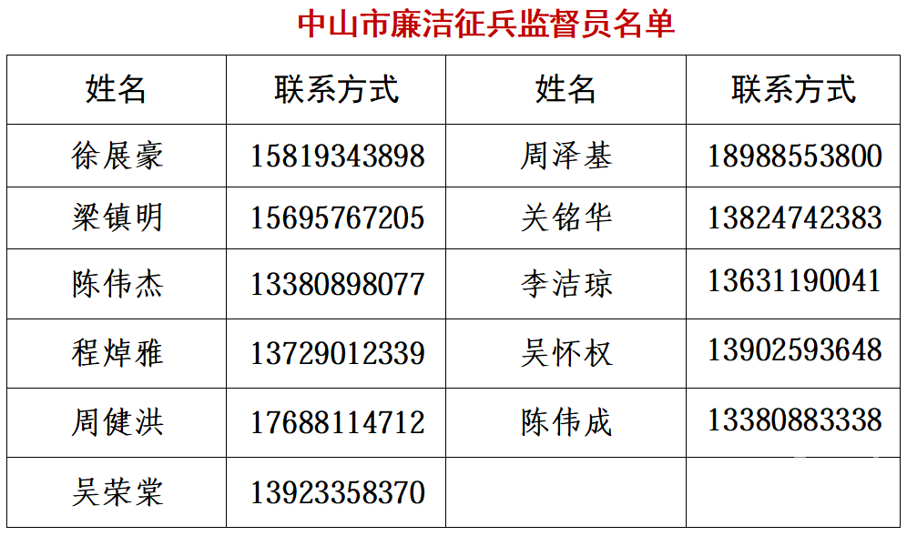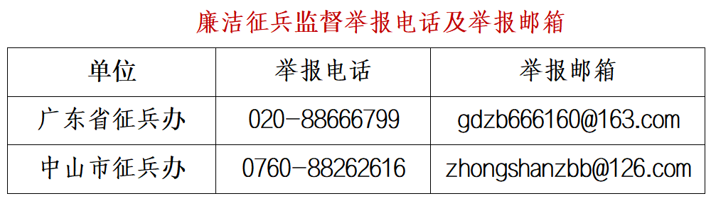 為嚴明兵員征集紀律,筑牢廉潔征兵底線,進一步提升征兵工作透明度,中山市征兵辦將2026年我市廉潔征兵監(jiān)督員名單及監(jiān)督舉報電話、郵箱予以公布。廣大市民若發(fā)現征兵違法違紀線索或廉潔征兵問題,可向廉潔征兵監(jiān)督員反映舉報,也可直接撥打省、市監(jiān)督舉報電話,或發(fā)送郵件至指定信箱反饋。