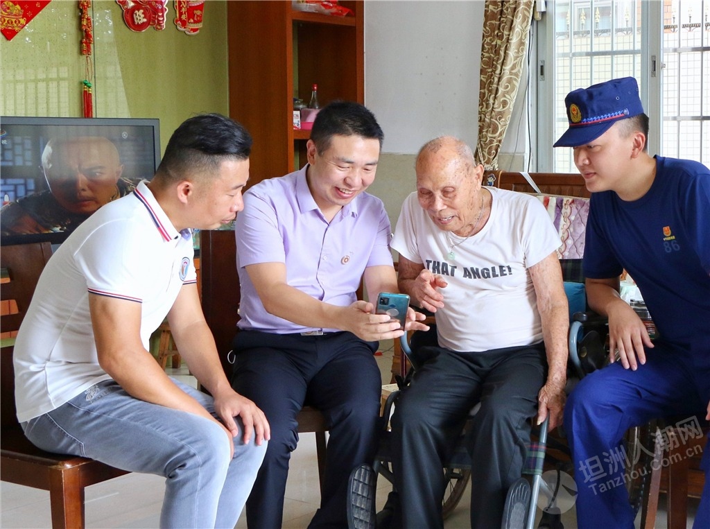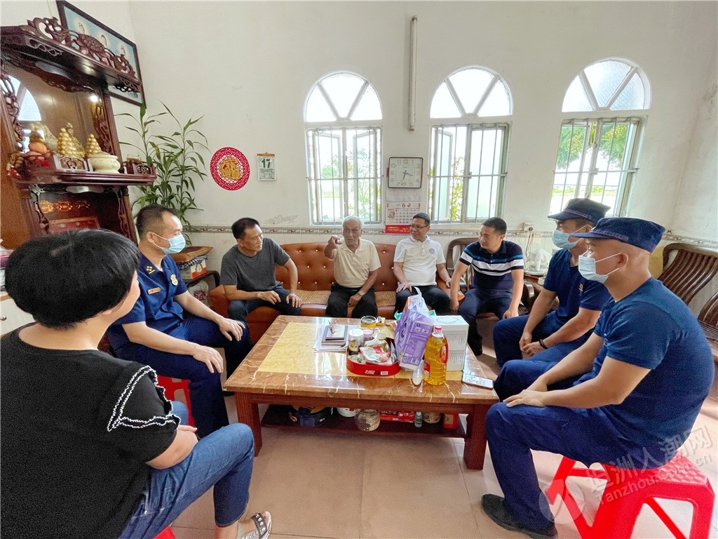 隨后,慰問(wèn)組還邀請(qǐng)參戰(zhàn)老兵鄭金洪走進(jìn)中山市消防救援支隊(duì)坦洲大隊(duì)講述革命故事,給與會(huì)黨員干部和部分基干民兵送上了一堂生動(dòng)、鮮活的紅色教育黨課,讓全體人員感受參戰(zhàn)老兵的精神洗禮。“在一次部隊(duì)作戰(zhàn)時(shí),我和另一名貴州籍的戰(zhàn)友去攻打一個(gè)火力點(diǎn),我們一起在山腳的一塊石頭處掩護(hù),但根據(jù)我以往的作戰(zhàn)經(jīng)驗(yàn),我覺(jué)得這里不安全,于是趕緊對(duì)他說(shuō)不要待在那塊石頭那,也不要站立,趕緊滾到下面的公路去;好在他聽從我的命令后,迅速地做出反應(yīng)。當(dāng)我們到達(dá)安全地方時(shí),長(zhǎng)舒一口氣,一直聽到有子彈嗖嗖嗖地從那塊石頭附近穿梭而過(guò);而那位戰(zhàn)友感慨地跟我說(shuō)‘班長(zhǎng),好在你迅速做出反應(yīng),不然我在那不是受傷就是死了?!编嵔鸷橐杂H身經(jīng)歷聲情并茂地向大家講述了當(dāng)年戰(zhàn)火紛飛的戰(zhàn)斗經(jīng)歷。 ▲慰問(wèn)組一行聆聽烈士遺屬陳北根講述他父親生前與敵斗爭(zhēng)的英雄故事。