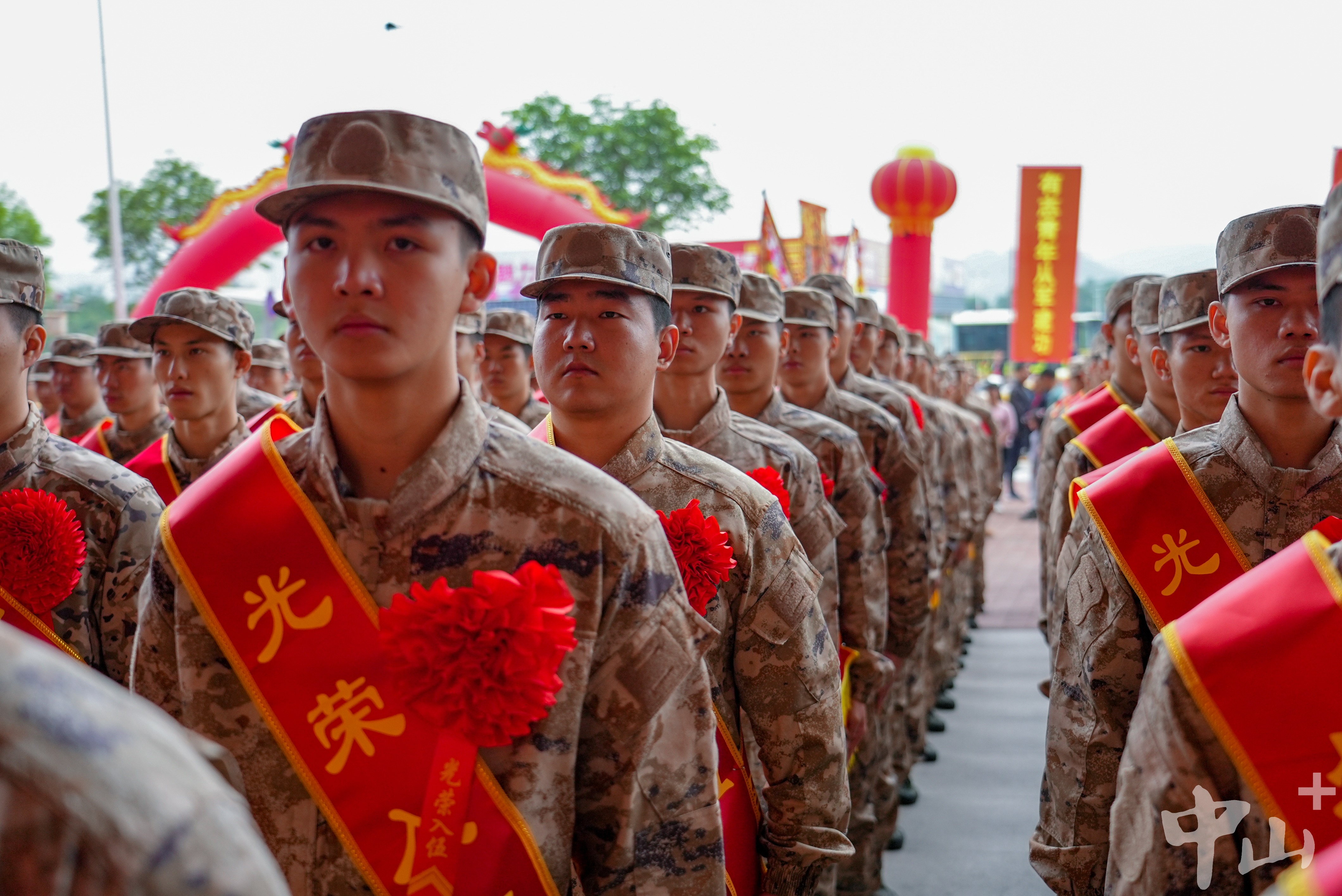 中山市征兵工作領導小組副組長、中山軍分區(qū)大校司令員李云濤,中山市征兵工作領導小組副組長、中山軍分區(qū)大校政治委員朱月明,市征兵辦副主任、市政府副秘書長梁克等出席大會。 歡送現場,新兵們戎裝整肅,身披“光榮入伍”的紅色綬帶,胸戴紅花,精神抖擻、軍姿挺拔。   新兵們戎裝整肅,精神抖擻、軍姿挺拔。記者 易承樂 攝