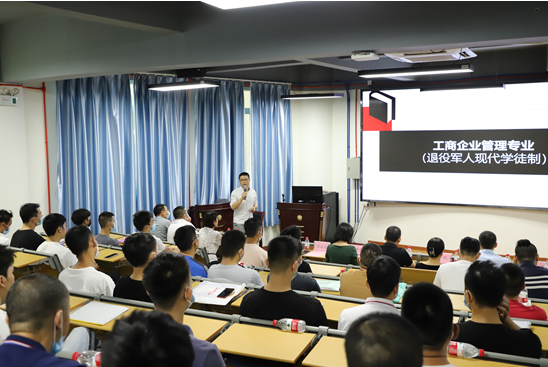 “狹路相逢勇者勝,在座的各位從繁忙的工作崗位上走出來,邁出繼續(xù)學(xué)習(xí)的關(guān)鍵一步,勇氣可嘉。三年后,相信大家一定會收獲知識、技能、學(xué)歷,更好地開啟新征程?!蓖艘圮娙爽F(xiàn)代學(xué)徒制項目開學(xué)典禮上,經(jīng)管學(xué)院院長肖紅在致辭中對新生們表示歡迎和祝賀,并表達(dá)了殷切期望,希望大家在求學(xué)期間,修德修身、克勤克儉、心懷理想,腳踏實地,融入多姿多彩的校園生活,在學(xué)生當(dāng)中彰顯軍人本色和榜樣力量。 市退役軍人事務(wù)局相關(guān)負(fù)責(zé)人對項目順利開班表示祝賀,對學(xué)院在項目申報、招生等工作中的辛勤付出表示衷心感謝。他介紹了項目實施的背景,指出開展退役軍人現(xiàn)代學(xué)徒制教育,是退役軍人安置工作的一項重要內(nèi)容,通過現(xiàn)代學(xué)徒制,讓大家成為全日制大學(xué)生,進(jìn)行正規(guī)系統(tǒng)的高等職業(yè)教育,是黨和政府送給同學(xué)們的一份沉甸甸的“大禮包”。同時,要求新生們盡快適應(yīng)由士兵到大學(xué)生的角色轉(zhuǎn)變,勤學(xué)善思,掌握就業(yè)創(chuàng)業(yè)本領(lǐng),發(fā)揚軍隊能打勝仗的優(yōu)良傳統(tǒng),爭創(chuàng)佳績,為祖國和地方經(jīng)濟(jì)建設(shè)再立新功。 學(xué)院工商管理專業(yè)主任沈孟康介紹了學(xué)校和學(xué)院概況,就學(xué)生日常管理、教學(xué)內(nèi)容、方式和計劃等作詳細(xì)說明。表示學(xué)校將采取在崗培養(yǎng)與學(xué)校培養(yǎng)相結(jié)合,堅持“標(biāo)準(zhǔn)不降、模式多元、學(xué)制靈活”,線上與線下混合教學(xué),實行工學(xué)交替、靈活多元的教學(xué)模式。經(jīng)管學(xué)院已配備了教授、博士等“精銳”師資團(tuán),“量身定制”人才培養(yǎng)方案,全力保障“八一班”的教育教學(xué)質(zhì)量。