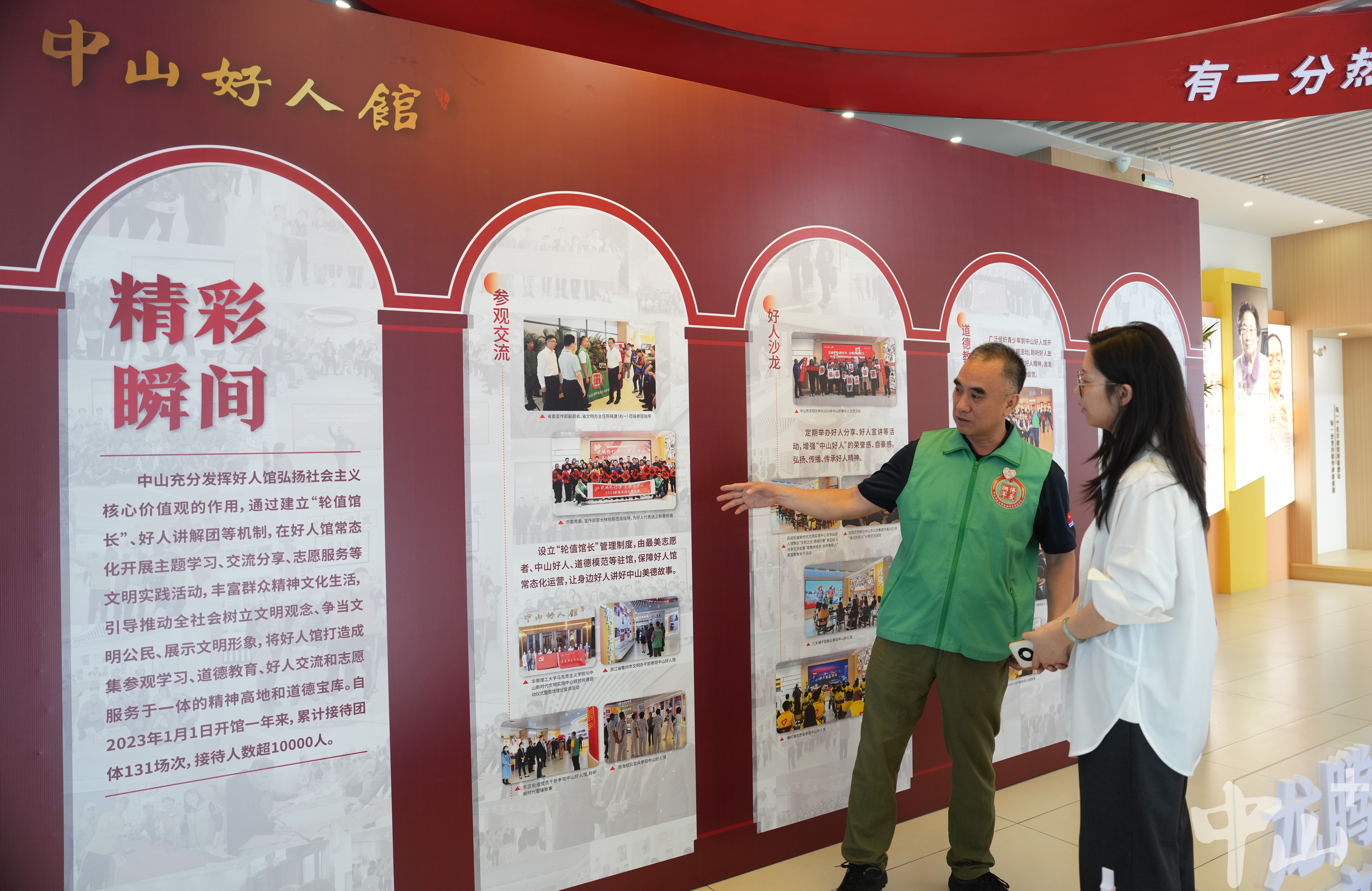 作為一名退伍軍人,李克有很多曾一起在戰(zhàn)場上出生入死的戰(zhàn)友,其中不乏已經(jīng)為國捐軀的烈士。自2007年起,他便自發(fā)組織尋找犧牲的中山籍戰(zhàn)友,先后6次帶隊(duì)前往廣西邊境的多個烈士陵園,成功尋到29名犧牲戰(zhàn)友信息,并將相關(guān)信息報(bào)送給中山市退役軍人事務(wù)局。 “我有一位戰(zhàn)友,寧愿把生的希望留給其他人,19歲不到就犧牲在戰(zhàn)場上。他們已經(jīng)離我們而去,更重要的是我們能為他們做些什么。所以逢年過節(jié)我都會看望他們的家人,把歡樂也帶給老人家?!崩羁苏f。 2016年,得知戰(zhàn)友的女兒患先天性心臟病,須進(jìn)行心肺聯(lián)合移植手術(shù),李克立即帶頭捐款,并聯(lián)系政府相關(guān)部門和電視臺,通過媒體報(bào)道讓更多愛心人士關(guān)注到了這位困難老兵。在他的多方奔走下,社會各界紛紛伸出援助之手,募集醫(yī)藥費(fèi)40余萬元,助戰(zhàn)友的女兒順利完成了手術(shù)。 牽頭成立志愿服務(wù)隊(duì) 延續(xù)志愿精神 作為一名有著30多年志愿服務(wù)經(jīng)歷的資深志愿者,李克的生活已經(jīng)與志愿分不開。他的身上始終有一抹綠色:在軍營,是守衛(wèi)國門的綠軍裝;在社區(qū),是服務(wù)群眾的綠馬甲。在人民群眾需要的地方,李克每次都沖在最前線。 “2020年疫情暴發(fā)時,很多人都響應(yīng)號召待在家里,我覺得作為一個打過仗的老兵,我總得站出來做點(diǎn)事?!睕]有過多考慮,李克第一時間加入到了志愿者隊(duì)伍中,并在社區(qū)堅(jiān)守了整整60天。當(dāng)時防護(hù)物資匱乏,李克還自掏腰包托人在廣州購買了6萬元左右的防護(hù)物資,全部捐贈給了在一線抗疫的工作人員。 近年來,李克還積極捐資助學(xué)、支援災(zāi)區(qū)、扶危濟(jì)困,連續(xù)6年資助6名困難學(xué)生,為汕尾市陸河中學(xué)捐贈10套多媒體電腦設(shè)備,堅(jiān)持參與無償獻(xiàn)血直到60歲。 2018年起,李克擔(dān)任文明城市巡查監(jiān)督員,奔走在街道各個路口、每條小巷,整理亂停亂放的共享單車,清理“牛皮癬”小廣告,保障街頭巷尾干凈衛(wèi)生。同一年,為更有組織地開展志愿活動,李克牽頭成立了一支以退役軍人為主導(dǎo)的東區(qū)博愛擁軍志愿服務(wù)隊(duì),把戰(zhàn)友們凝聚在一起,共同為社會作貢獻(xiàn)。如今,這支志愿服務(wù)隊(duì)已從最初的8名成員,逐漸壯大至400多人,成為服務(wù)社會的一支生力軍。 講好好人故事,傳承紅色文化 4月19日上午,記者在“中山好人館”見到了正在擔(dān)任“輪值館長”的李克。從去年1月開始,他每個月都參與輪值,先后為140多場活動、1萬多名市民群眾義務(wù)講解博愛之城的凡人善舉、好人大愛。  正在中山好人館輪值的李克。記者 劉萬杰 攝