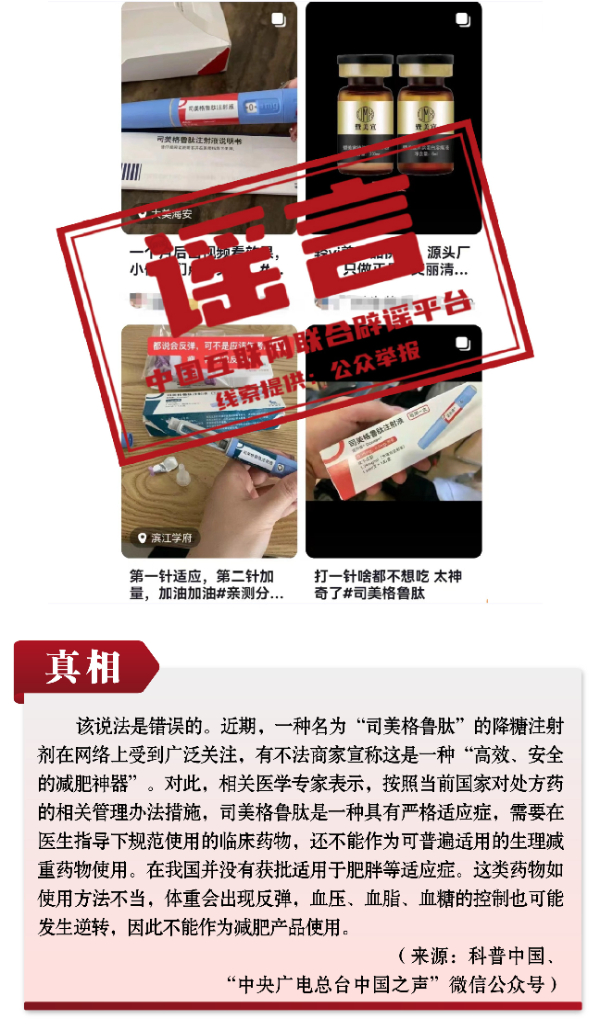 有關(guān)呼吸道疾病防治的謠言和誤區(qū)誤導(dǎo)公眾。隨著各地陸續(xù)入冬,呼吸道疾病進入高發(fā)季節(jié),多種呼吸道疾病交織疊加,難免讓人焦慮。恰在此時,網(wǎng)上一些治病養(yǎng)生醫(yī)藥“偏方”頻出,一些自媒體假借專業(yè)人士和醫(yī)生網(wǎng)上“開方”,真假難辨、誤導(dǎo)公眾。如“感染肺炎支原體會得肺炎、會出現(xiàn)‘白肺’”“可自行給孩子服用阿奇霉素等藥物以預(yù)防支原體肺炎”“可網(wǎng)上購買‘醫(yī)院同款’霧化器在家自療”等謠言,抓住人們對疾病的恐懼心理大肆傳播,有的耽誤正常治療,有的則是“假科普、真帶貨”。此外,“使用司美格魯肽能輕松減肥”的謠言,無視權(quán)威部門對處方藥的相關(guān)管理辦法措施,此類藥品若盲目使用或者使用不當(dāng),存在很大健康風(fēng)險。