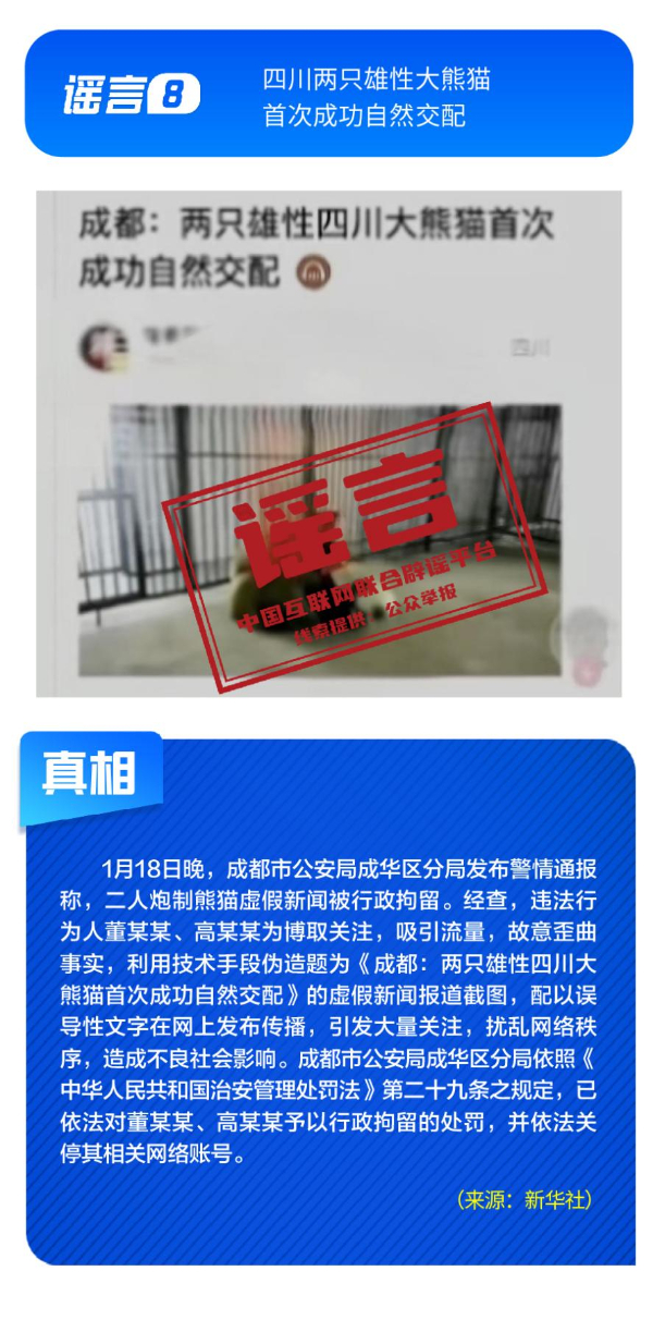 健康與科普領(lǐng)域謠言違背客觀規(guī)律。“人血白蛋白是‘增加免疫力’的法寶”刻意夸大該處方藥的臨床用途,忽略其特定醫(yī)療場景與使用風(fēng)險(xiǎn);所謂“大棚草莓、冷庫葡萄、進(jìn)口車?yán)遄?、染色砂糖橘是冬天水果界四大毒王”謠言片面解讀農(nóng)產(chǎn)品種植與保鮮方式,缺乏科學(xué)依據(jù);“四川兩只雄性大熊貓首次成功自然交配”純屬為吸引流量而捏造的獵奇內(nèi)容,其視頻畫面為AI生成;“2026年8月12日地球?qū)⑹ヒ?,?dǎo)致6000萬人死亡”更是無中生有的荒謬謠言。