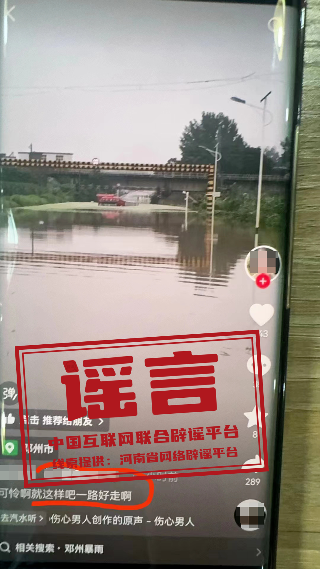 7月15日,網(wǎng)民“神x”在某短視頻平臺發(fā)布“貨車司機被淹”視頻,并配文稱“可憐啊,就這樣吧,一路好走”。經(jīng)核實,7月14日,鄧州市鐵路橋下一外地牌照貨車被淹,車內(nèi)被困人員已被成功救出,無人員傷亡,該信息與事實嚴重不符,系虛假信息。