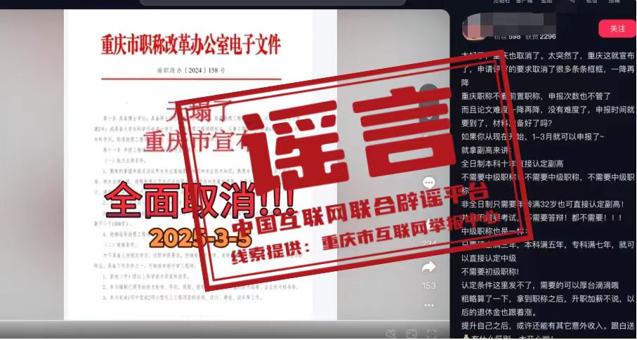 真相:近日,有網(wǎng)民在互聯(lián)網(wǎng)平臺(tái)發(fā)布消息稱“重慶市宣布,申請(qǐng)?jiān)u審的要求取消了很多條條框框,職稱申請(qǐng)不看前置職稱,全日制本科十年直接認(rèn)定副高,不需要中級(jí)職稱”,引發(fā)關(guān)注。經(jīng)核實(shí),網(wǎng)傳信息系謠言。職稱評(píng)審均需逐級(jí)晉升,取得上一級(jí)職稱并滿足相應(yīng)學(xué)歷資歷條件后方可晉升高一級(jí)職稱。目前重慶市除特殊人才、博士后等3個(gè)針對(duì)特定對(duì)象的職稱申報(bào)綠色通道外,正常申報(bào)通道均需逐級(jí)晉升。網(wǎng)傳文件是網(wǎng)民通過P圖軟件編輯而成,試圖吸引不明真相的群眾咨詢,借機(jī)推銷職稱代辦服務(wù),收取高額費(fèi)用。目前,謠言線索已轉(zhuǎn)交公安機(jī)關(guān)進(jìn)一步調(diào)查處置。(來(lái)源:“重慶辟謠”微信公眾號(hào))